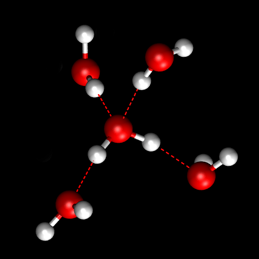 Reproduire l’ensemble des propriétés de l’eau au moyen d’une simulation atomistique est donc une gageure. Pour les raisons évoquées ci-dessus, tout modèle doit par exemple être en capacité de prédire un environnement autour d’une molécule d’eau comprenant quatre liaisons hydrogène avec des molécules d’eau voisines pour la glace ordinaire, c’est-à-dire une structure tétraédrique, leur nombre diminuant avec la température dans le cas de l’eau liquide. Ces liaisons hydrogène sont par ailleurs très fugaces en phase liquide (environ une picoseconde soit 10-12 s), et leur réarrangement incessant peut s’observer au cours d’une simulation par dynamique moléculaire.