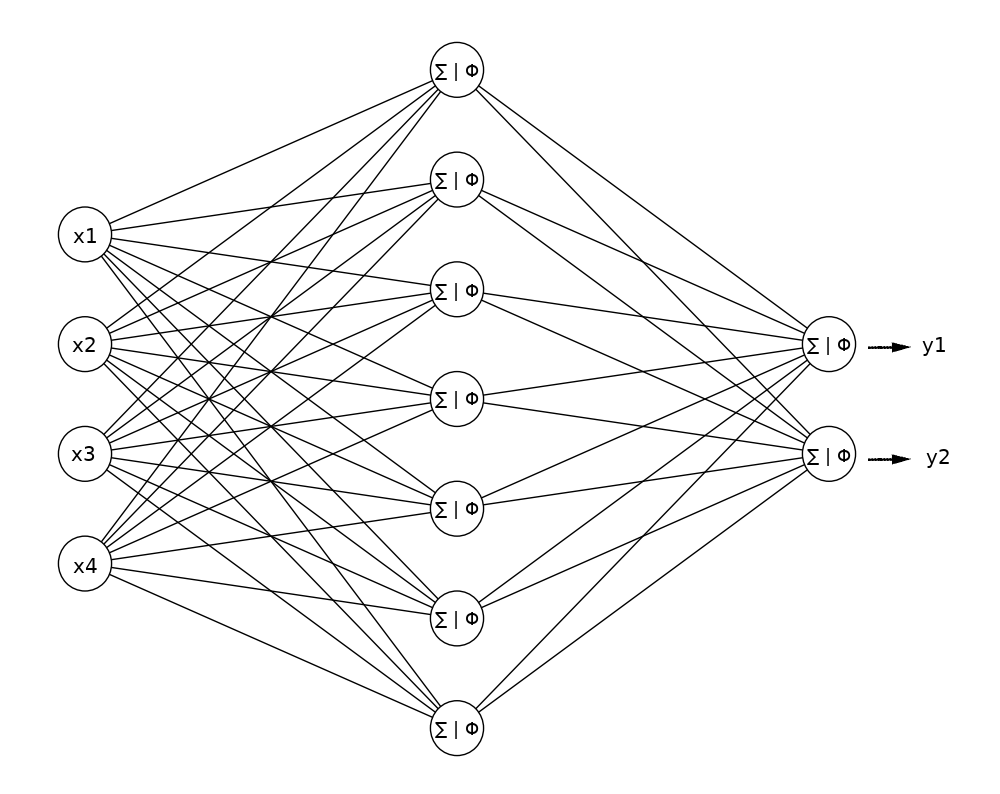 Vers la fin des années 80, les chercheurs ont réalisé que pour traiter des problèmes plus complexes, plusieurs neurones artificiels devaient être complètement connectés et organisés en couches. On distingue les couches d’entrée (x) et de sortie (y), et les couches cachées intermédiaires.
