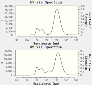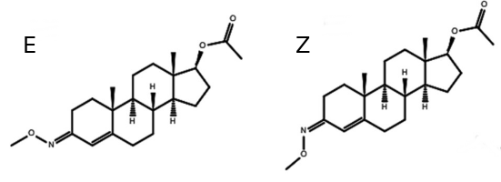 Quand ils sont obtenus à partir de la methoxylamine au lieu de l’hydroxylamine, ces diastéréoisomères produisent deux pics distincts en chromatographie. Leur attribution peut se faire grâce au calcul de leurs énergies d’excitation électronique par la théorie de la fonctionnelle de la densité (DFT) dépendante du temps. Les figures ci-dessous présentent ainsi les spectres UV-visible calculés par TDDFT des isomères E (en haut, avec un pic maximum à 252 nm, à comparer avec une valeur expérimentale de 247 nm) et Z (en bas, avec un pic maximum à 258 nm, à comparer avec une valeur expérimentale de 257 nm) du dérivé oxime du testostérone enanthate.
